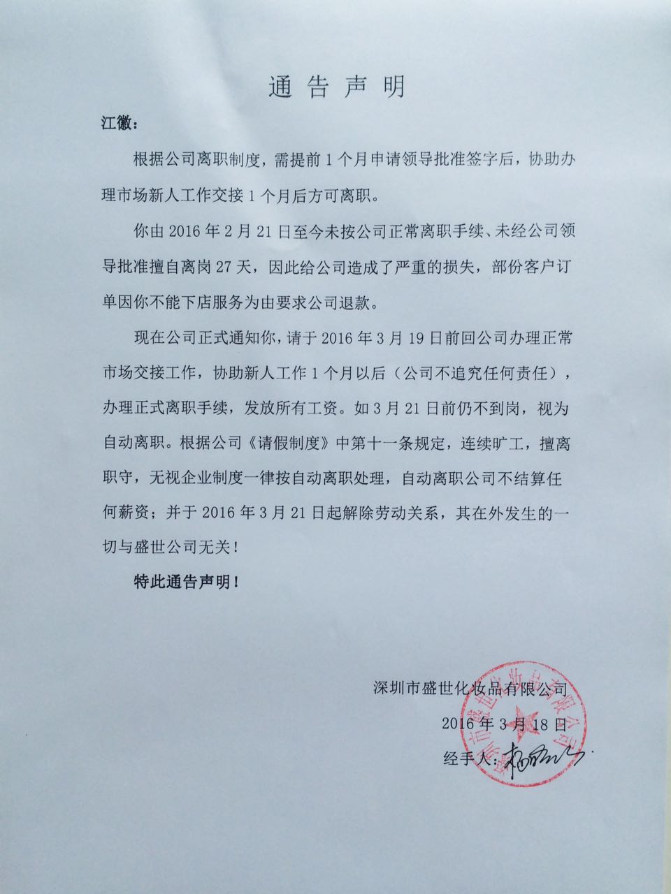 關(guān)于公司離職制度的通告聲明